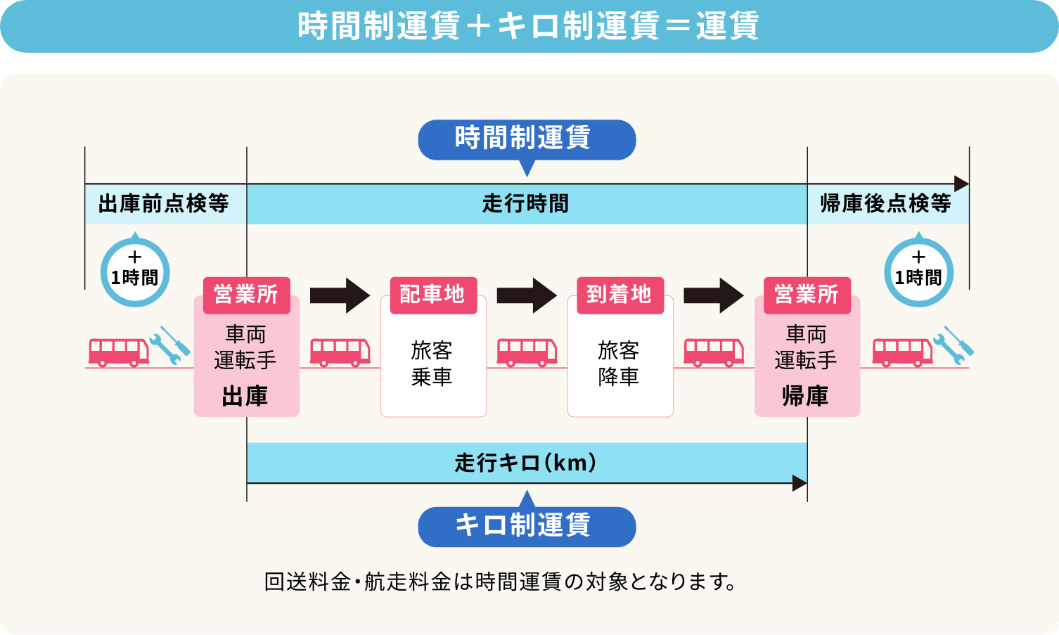 走行キロ(出庫から帰庫までの距離をいい、回送距離を含む。)に1kmあたりの運賃額を乗じた額とする。